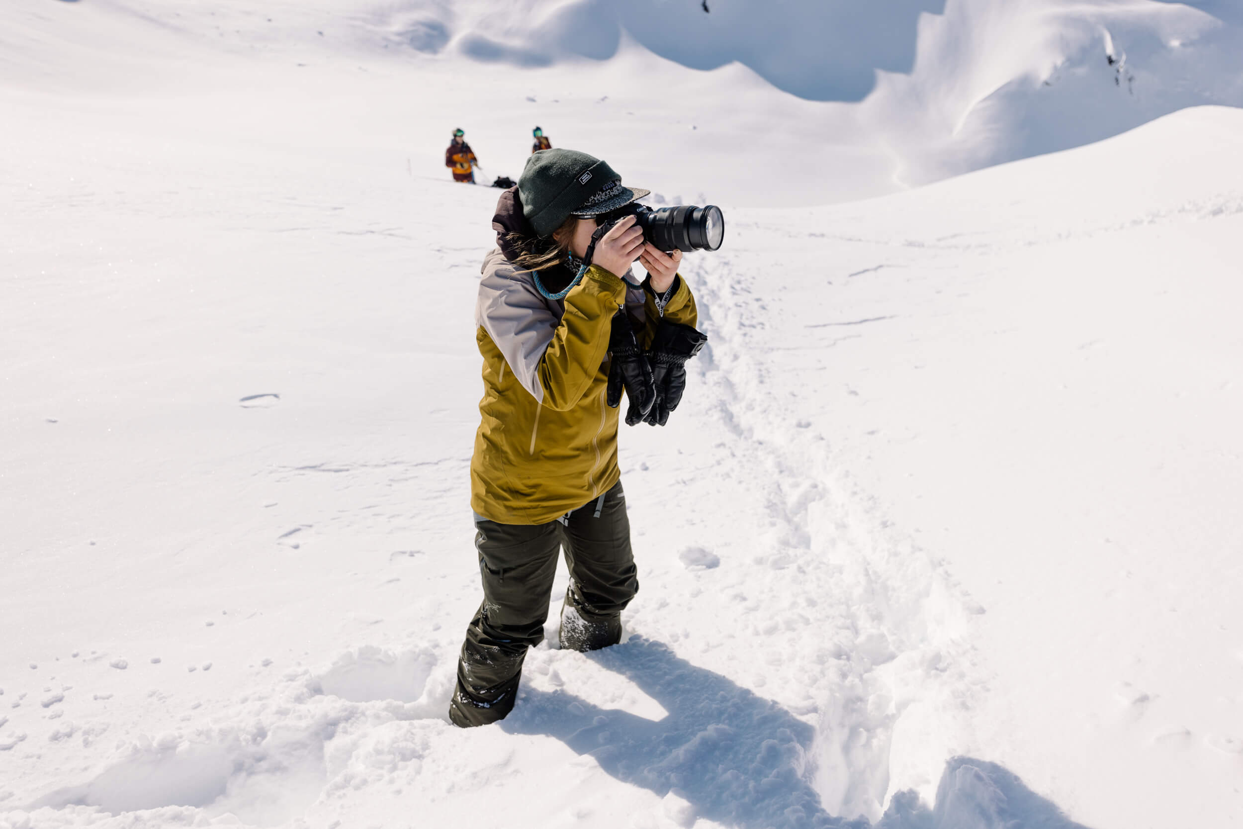 Katie: It had some beautiful cross light from the setting sun, which helped backlight the photo, really making the highlights and shadows pop. We posted up until the athletes dropped, and it was this little exposed ridgeline with a small section for us to walk around on. With this line, I was drawn to the crazy textures in the snow and decided to shoot vertically to emphasize the repeating vertical lines. I’ve never seen snow make runnels like that before, so I wanted that to be a major part of the story in this image.